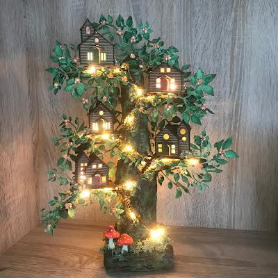 I put a light string under the stairs and through a hole in the platforms so the tree could light up. I glued the lights to the tree with a hot glue gun.